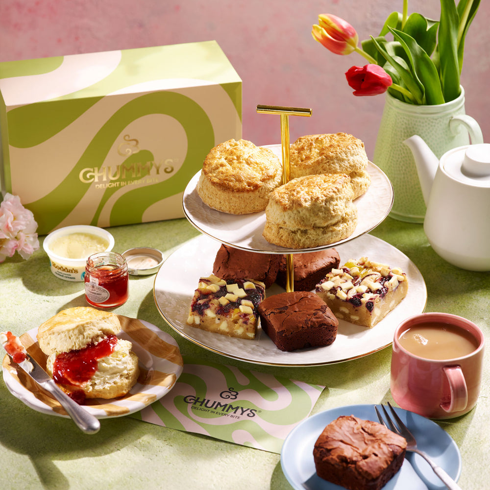 Indulge in a delightful afternoon tea experience with our curated selection. Savour the richness of our original brownies and enjoy the light, buttery flavour of our plain scones. Treat yourself to the zesty sweetness of lemon and blueberry blondies, perfectly paired with jars of fresh strawberry jam and pots of creamy clotted cream. To complete your afternoon ritual, sip on the comforting warmth of our Fairtrade English breakfast tea bags. An irresistible combination of flavours that will make your afternoon tea truly memorable.